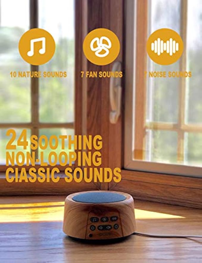 • AESTHETICALLY PLEASING & PORTABLE SIZE: Featuring stylish wood grain finish, this sound machine matches any decor at nursery room ; office; bedroom; hotel room; kid’s room perfectly. This portable sound machine Weighing 9.7 ouces and measuring 2.3 inches high; this fits easily into your backpack or suitcase and makes it great for travel or in-office use to relieve anxiety and sleep better .