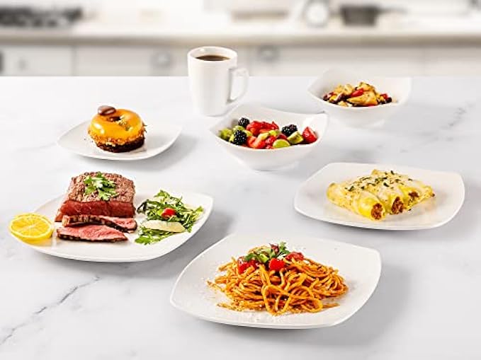 • HIGH-QUALITY PORCELAIN: This sophisticated, premium-quality white dish set has the right balance of weight and size, making family mealtimes extraordinary for years to come. Our square dinnerware set is microwave and oven safe, making cooking simple and quick. Note: Handle with care, as the plates and bowls can get hot when placed in the microwave.