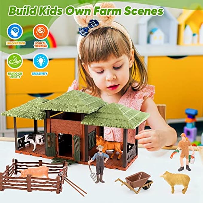 • 【67PCS Farm Animals Playset】BAZOVE farm animal toys set includes 6 farm animals figures(horse, cow, sheep, pony, dog, pig), 2 farmer figures, a set of unassembled toy barn (3 roofs, 4 walls, 2 doors, 2 windows, 1 doorstep, 4 fences, 3 bases, 7 fixed buckles, 12 pillars), 8 fences, 6 trees, 1 wheelbarrow, 2 haymows, 4 farm tools, your kids will spend hours building their farm scenes