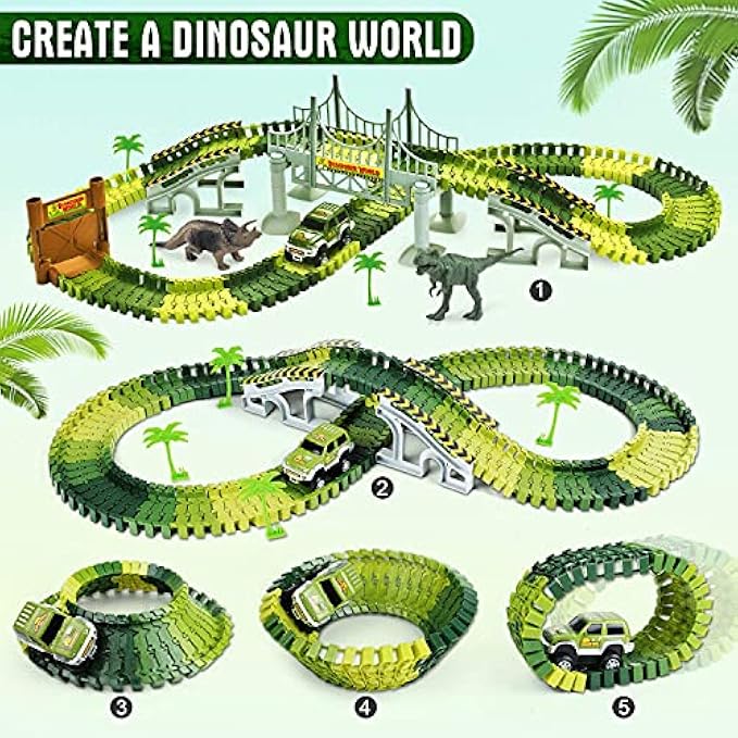 Dinosaur Toys, Create A Race Car Track Dino World with Flexible Train Track and 2 Cool Cars, Best Gift for Toddler Kids Boys Age 3 4 5 6 Year Old