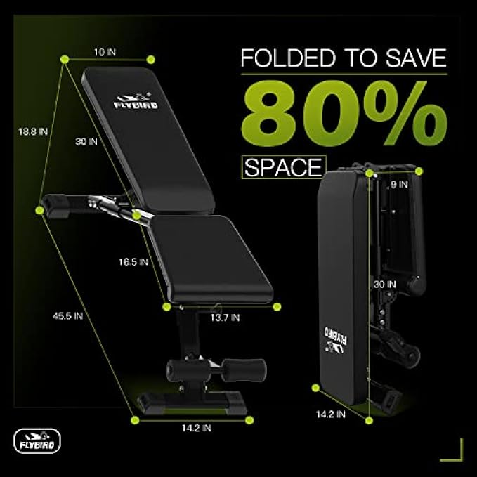 • 【Save 80 percent space】; FLYBIRD foldable bench, easy to carry and no assembly needed, folded size 30 inch long 16 inch wide 9 inch high; You can put it in the corner or under the bed when you finish workout