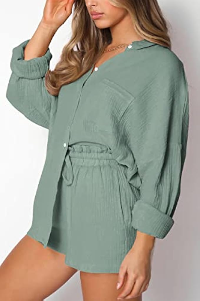 • Occasions:This casual loose 2 piece outfits with long sleeve button up top and drawstring shorts is not only suitable for home, happy leisure time, but also suitable for party, office, entertainment, vacation, beach, picnic, sports, post partum,etc.Don't hesitate to buy the track suits for women set, this two piece set is amazing!