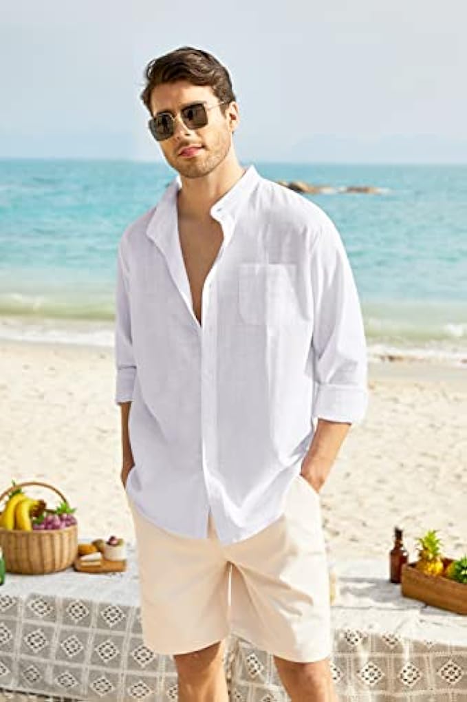 BAND COLLAR - Collarless design makes linen shirt great for summer and keeping cool, while still maintaining sophisticated and casual. Long sleeve cotton shirt is great for sun protection and also convenient for rolled cuffs to further its easy-going feel.