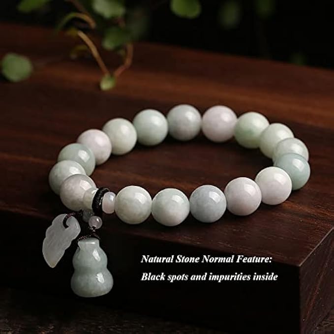 Natural Jade Beaded Bracelet for Women and Men, White Green Jadeite 9mm 10mm Round Stackable with Lucky Charm Jewelry Birthday Gift for Her Him (Gourd Charm)