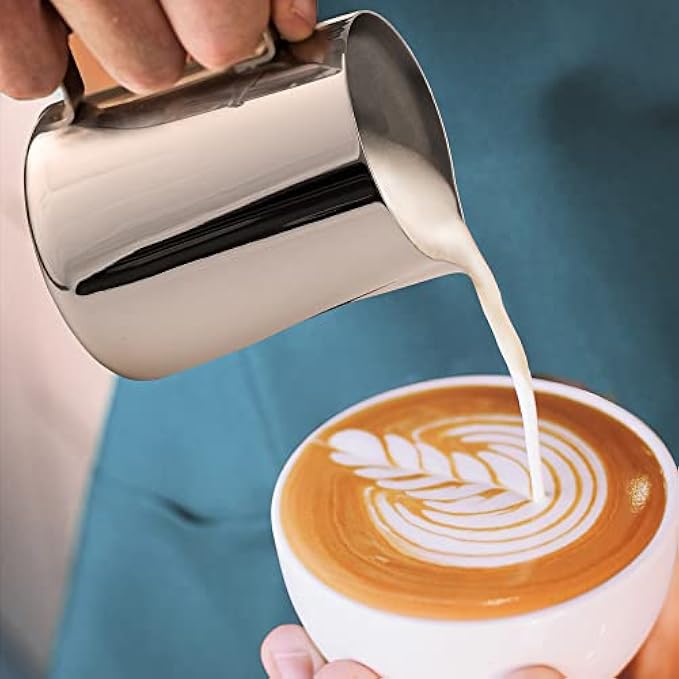 • MILK FROTHING PITCHER: Channel your inner barista with our food grade stainless steel milk frother cup. We have designed our 350 ml frothing pitcher, marked with oz and ml measurements, with an ergonomic handle and spout to make your coffee-making experience smooth and precise. Use it as a milk steaming pitcher with coffee machines or for latte art and measuring liquids.