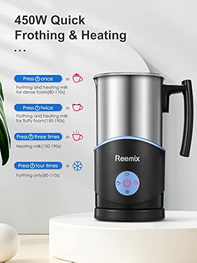 Milk Frother, Reemix 11.8oz Electric Milk Steamer Soft Foam Maker With Large Open,4 IN 1 Multifunction for Hot & Cold Froth, Automatic off & Easy Cleaning,Silent Operation (Blue)