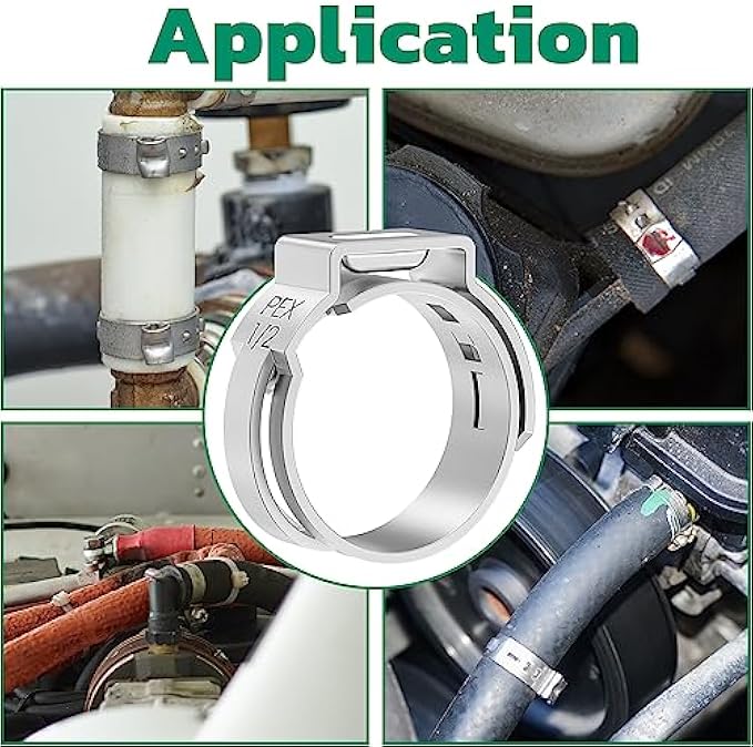• Applications Introduction: The single ear hose clamps can be used for indoor and outdoor pipes, hoses, tube, oil pipes, pex tubings and any other plumbing system. Perfect for water supply system, water heater, air condition system, pipeline system, hydronic heating, electrical plumbing, automotive, industrial, marine etc.