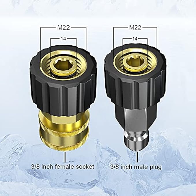 • ♛【3/8 Quick Connect Pressure Washer Hose】The hose is equipped with 3/8" quick connector which is not only easy to connect & disconnect, but also helps connect firmly to the pressure washer without being easily shaken, damaged, rusted or leaked. 2 pcs pressure washer adapter, m22 14 mm to 3/8 hose quick connect what you want.