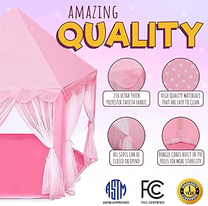 • #1 IN CHILD SAFETY – ASTM & FCC CERTIFIED Keeping your kids safe is our first and foremost priority at ORIAN. That is why we designed our kids playhouse tent by the strike standards of the American Society for Testing and Materials, which helps to ensure that only quality, raw materials are used. Rest easy knowing your kids are protected from harmful chemicals and dangerous designs aspects with our princess castle play tent.
