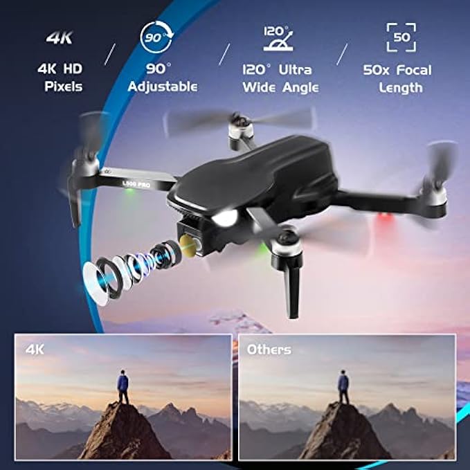 • 4K UHD Camera 50x Zoom:L500 PRO offers 4K Ultra HD image (3840×2160p) with 120° wide-angle and 90° adjustable and 50x Zoom. Enhance the stability of aerial images, so that each scene memories clear, yet smooth.