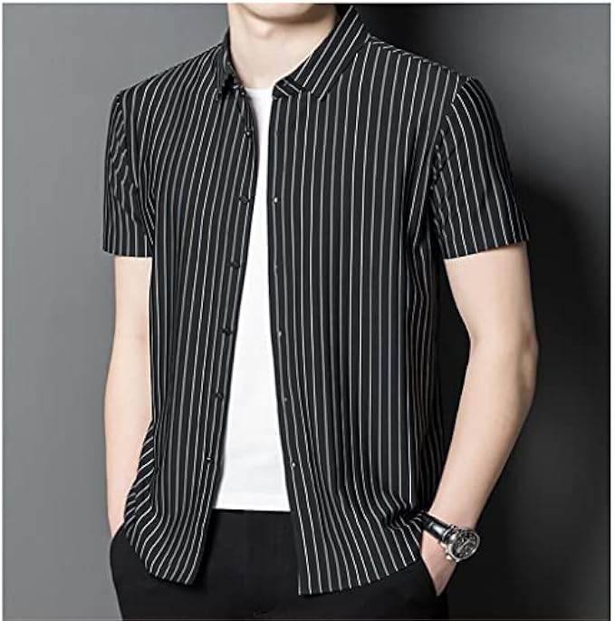 PNNERR Summer Young and Middle-Aged Men's Lapel Short-Sleeved Shirt Men's Middle-Aged Fashion Thin Striped Top Trendy (Color : E, Size : XL)