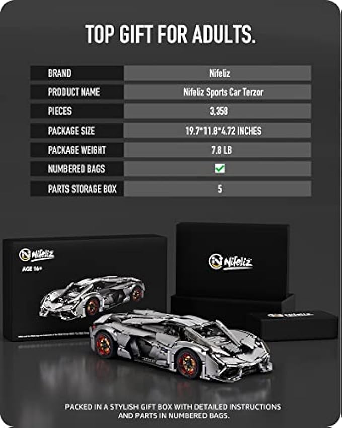 • Fabulous gift for adults - Comes from Nifeliz large car collection, this striking building toy is a decent gift for adults. Packed in a modish gift box, this stunning supercar mock-up set requires no more extra packaging, great for gift giving or collection.